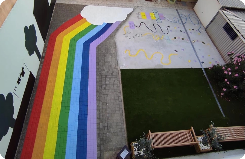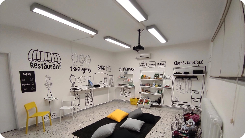 Οι αίθουσες διδασκαλίας και υποδοχής είναι ευήλιες και ευρύχωρες, και κάθε μία έχει «θέμα» την ιστορία ενός παραμυθιού.